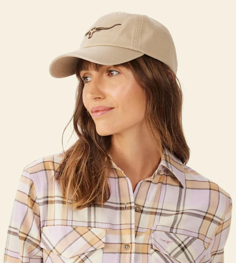 Crafted from 100% organic cotton twill, this cap features an embroidered Longhorn logo and an adjustable strap with a brass branded logo metal clasp.