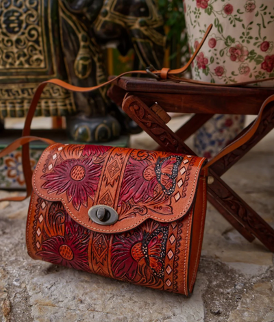 Leather Hand Tooled Cross Body Bag - Turquoise Detail