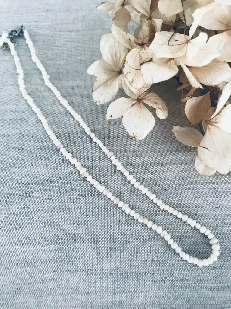 The Seed Pearl Necklace is a delicate piece featuring tiny freshwater seed pearls strung along a fine, minimalist chain. Subtle and timeless, it’s perfect worn alone for a classic look or layered with your favourite necklaces.